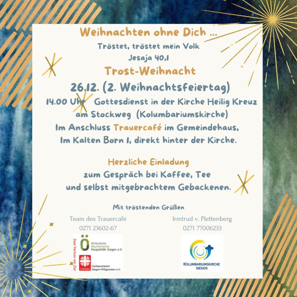 Am 26.12.2025, findet um 14 Uhr, ein Trost- Weihnachtsgottesdienst für und mit trauernden Menschen, in der Kirche Heilig Kreuz (Kolumbariumskirche) am Stockweg, in 57076 Siegen-Weidenau, statt.